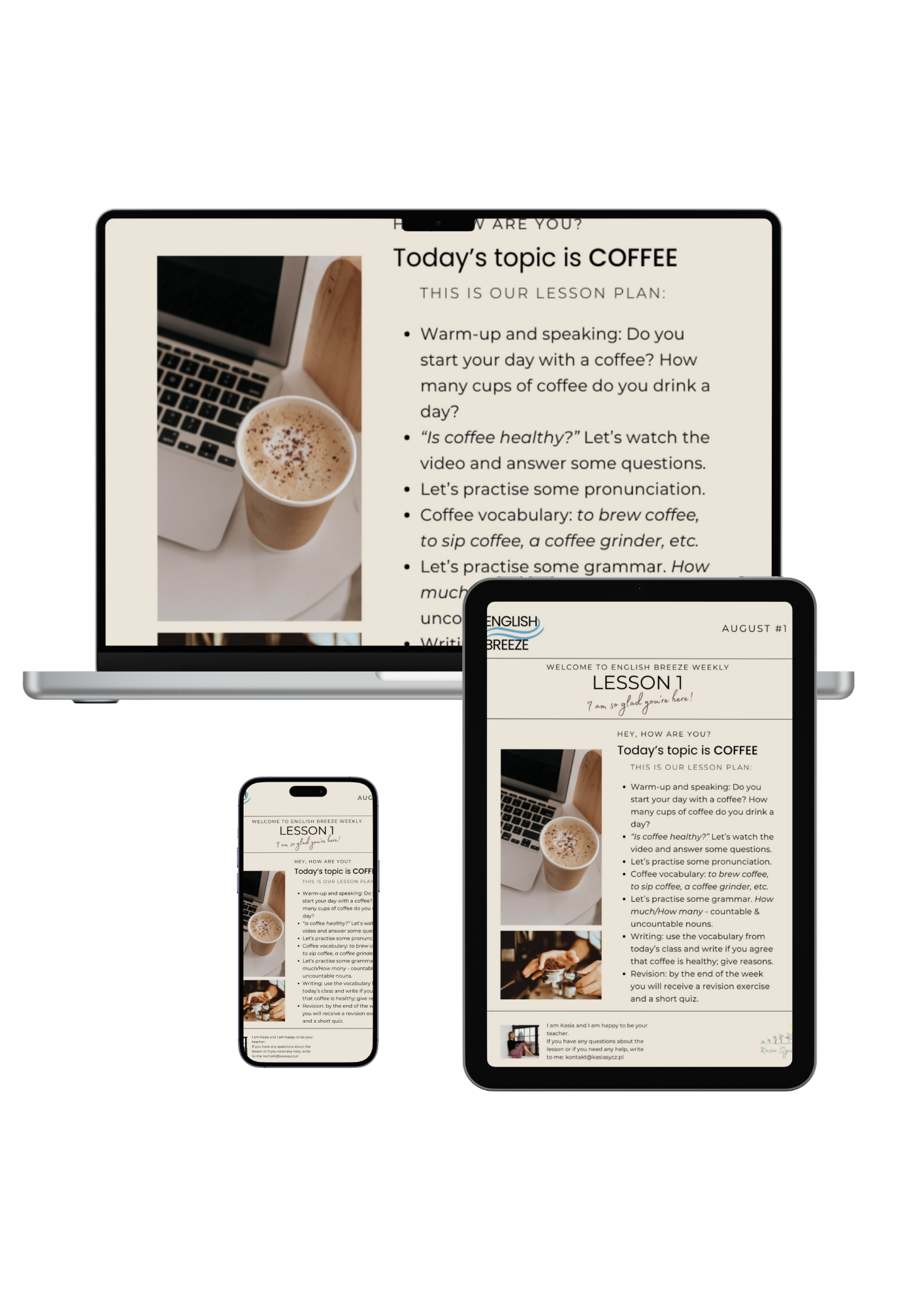 ENGLISH BREEZE to 4 lekcje w miesiącu, 1 raz na tydzień, które wpadają wprost do Twojej skrzynki mailowej.